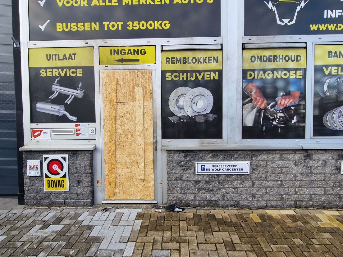 De deur van het garagebedrijf na de tweede explosie op 30 augustus. Foto: Rijnmond