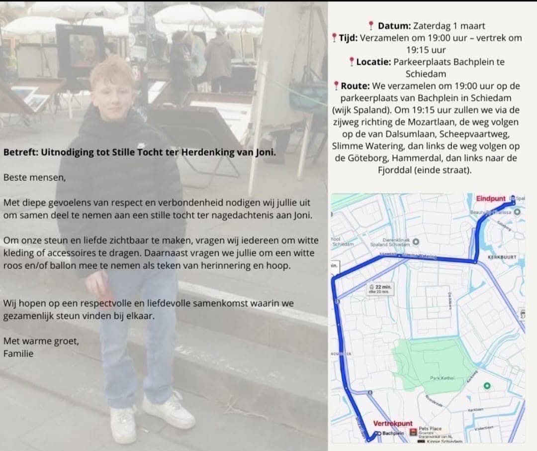 Op initiatief van de familie van de 13-jarige Joni wordt komende zaterdag 1 maart een stille tocht gehouden in Schiedam-Noord. De jongen overleed zondag na een steekincident. In verband met het incident is een 13-jarige leeftijdsgenoot opgepakt. De familie roept via social media en kennissen op om het bericht over de stille tocht zoveel mogelijk te delen.